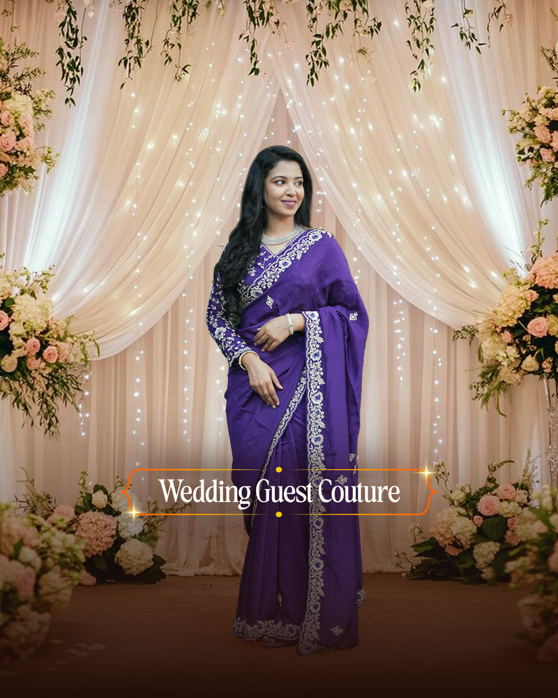 Organza fancy saree purple color allover work & cutwork border with running pallu and plain blouse