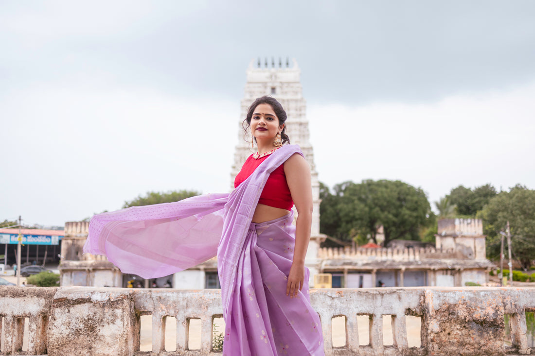 Organza fancy saree lavender color allover weaves & zari border with short pallu and plain contrast blouse
