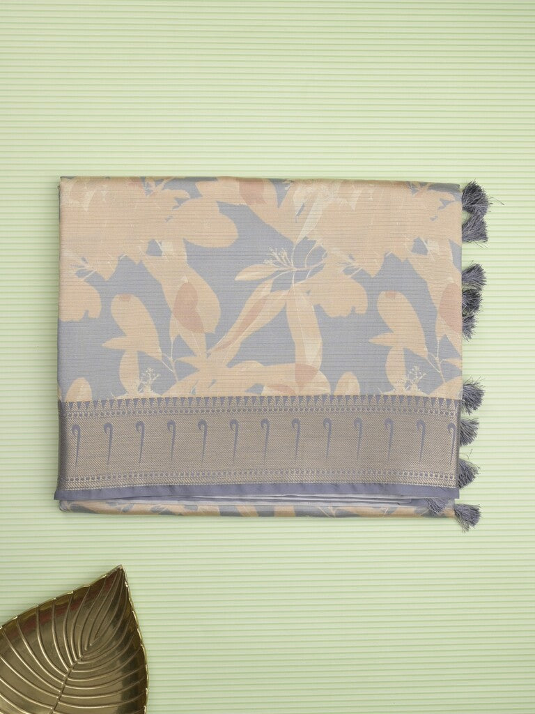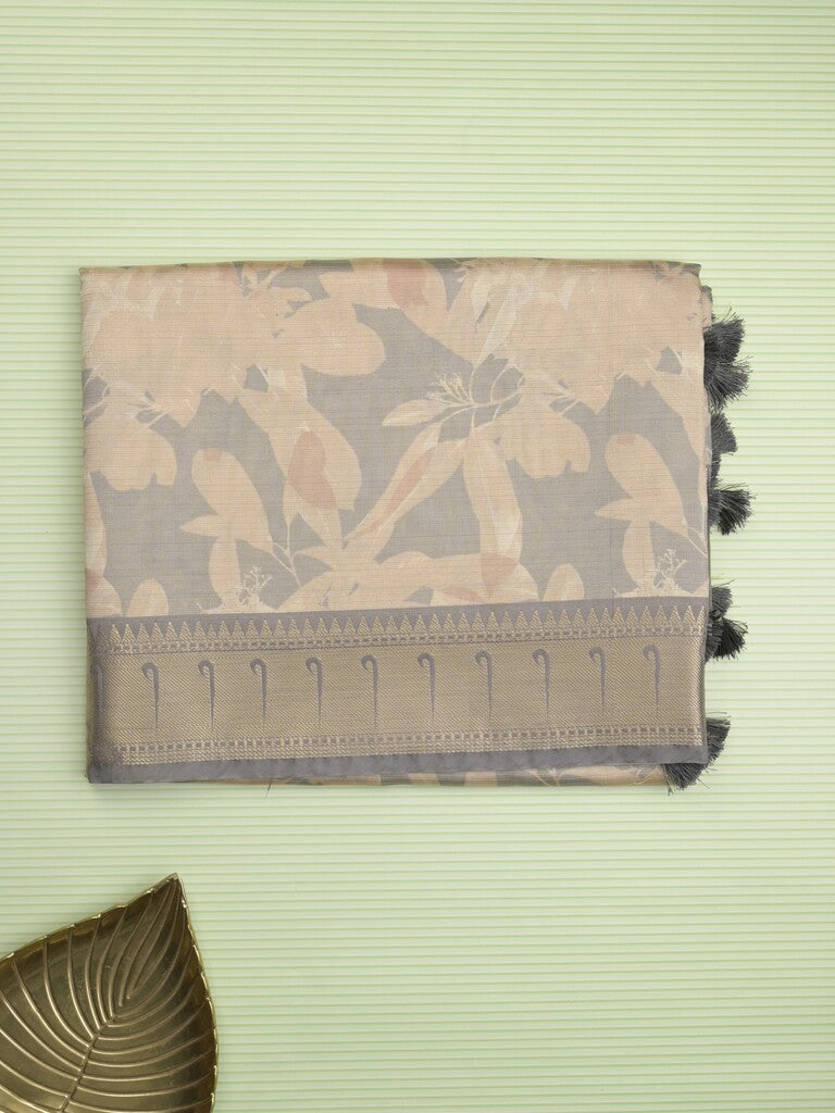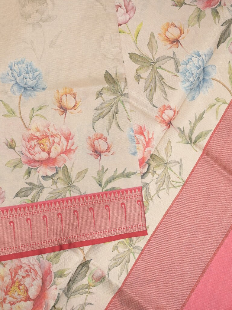 Banaras digital print fancy sarees light cream color allover prints & zari border with short pallu and contrast blouse