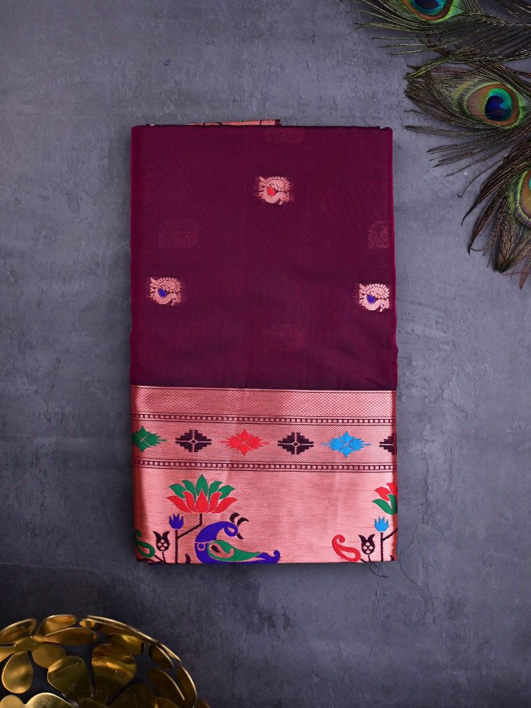 Banaras fancy saree maroon color allover zari motifs & paithani border with paithani pallu and attached blouse