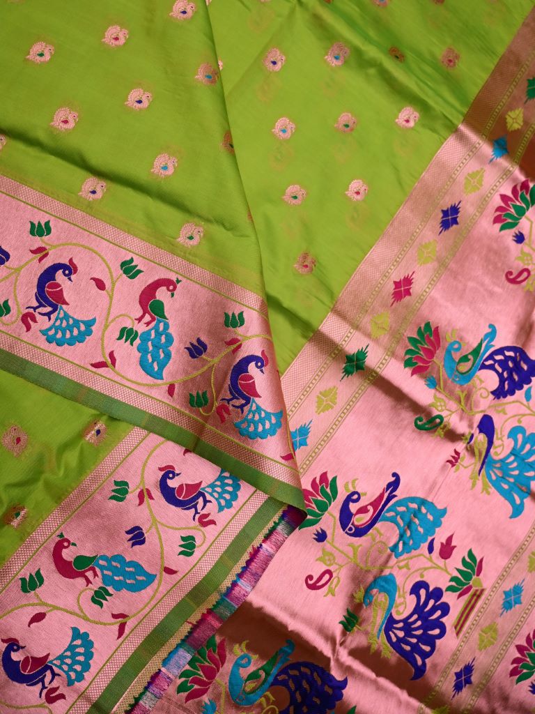 Banaras fancy saree parrot green color allover zari motifs & paithani border with paithani pallu and attached blouse
