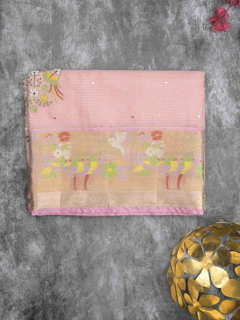Chanderi fancy saree light pink color allover embroidery & zari border with short zari pallu and attached plain blouse