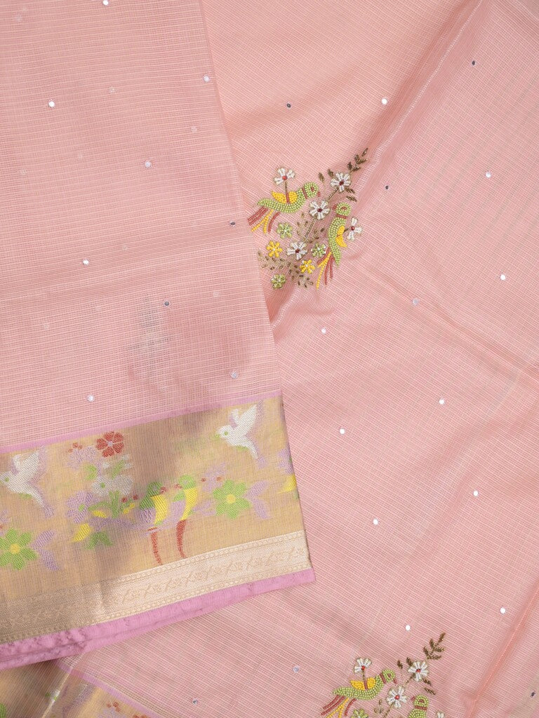 Silk kota fancy saree baby pink color allover embroidery, mirror work & zari border with running pallu and plain blouse