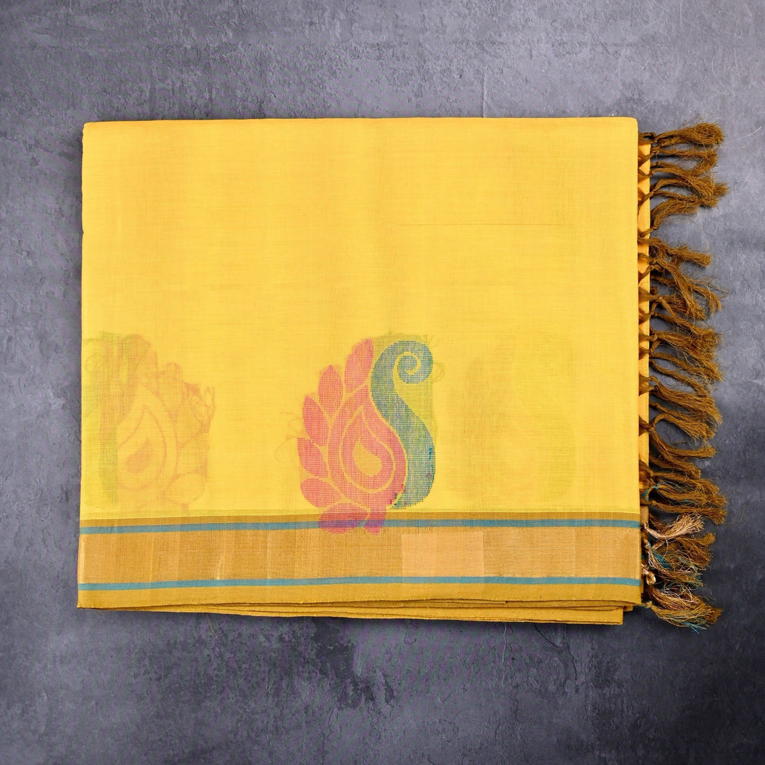 Kanchi cotton saree musturd yellow color with thread motive weaves, small zari border, contrast pallu and plain blouse.