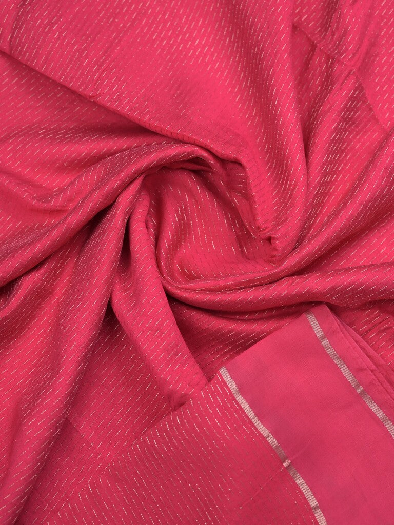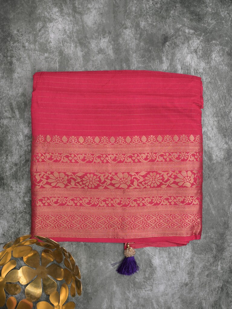 Banaras satin fancy saree pink color allover stripes & zari border with rich pallu and attached blouse