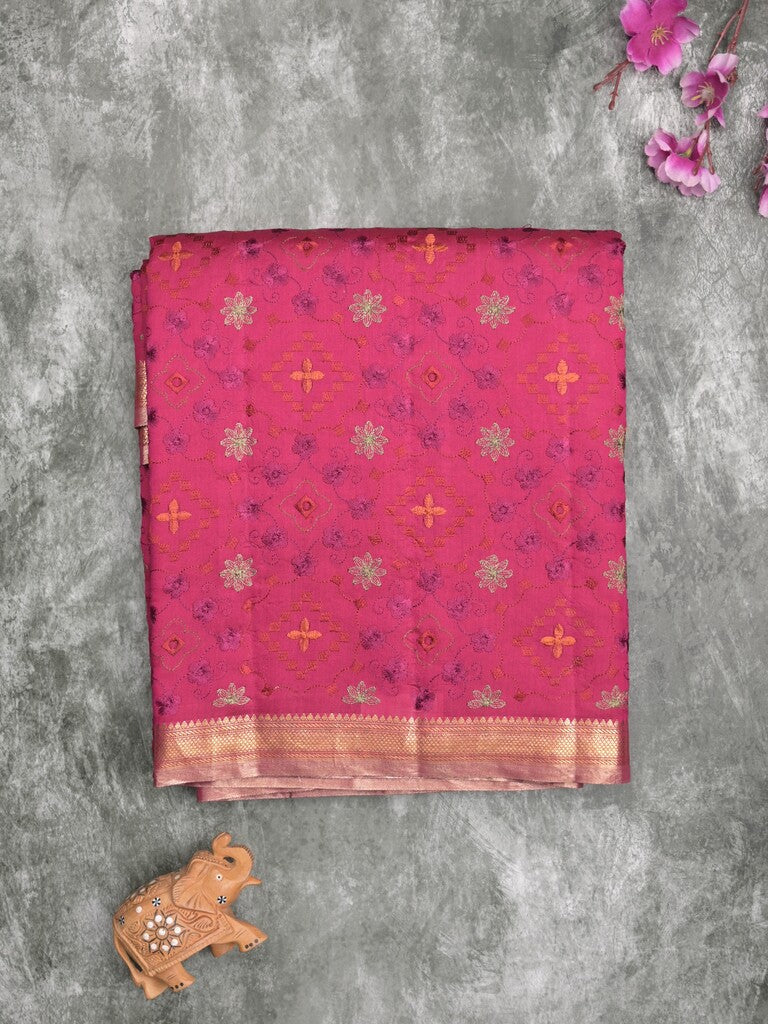 Dupion fancy saree pink color allover motifs & zari border with zari pallu and brocade blouse