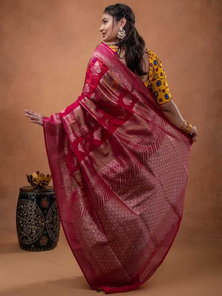 Pure organza fancy saree pink color allover zari weaves & zari border with rich pallu and contrast blouse