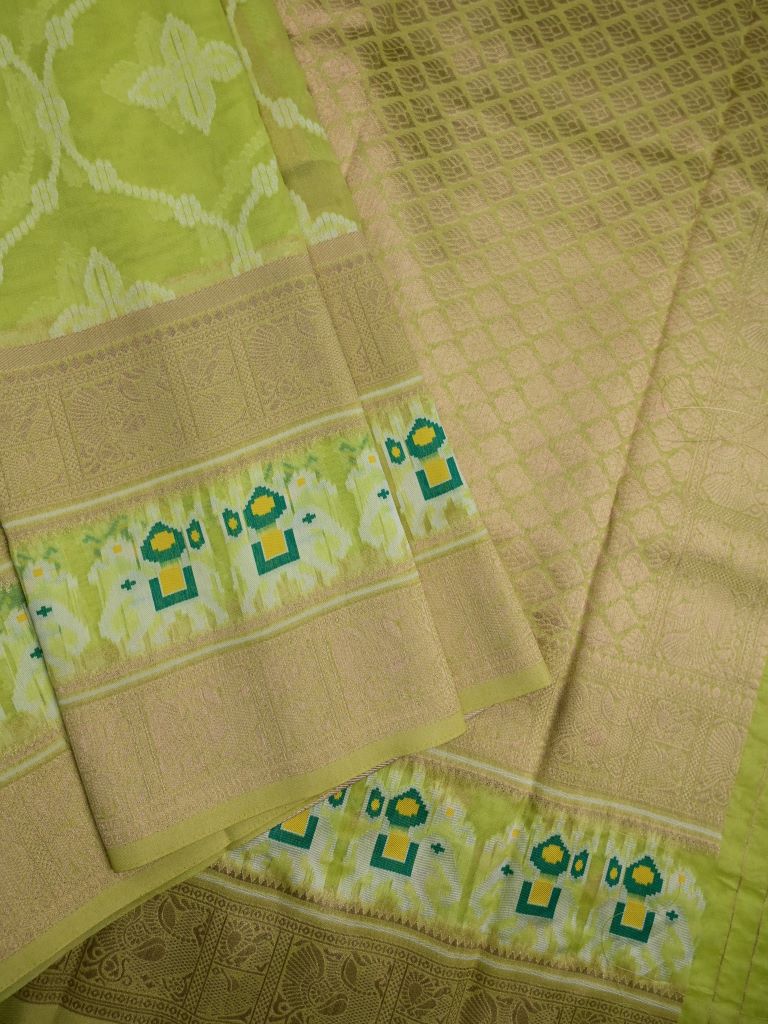 Dupion fancy saree parrot green color allover zari weaves & ikkath zari border with rich pallu and attached self blouse