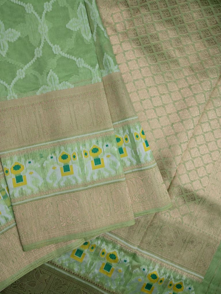 Dupion fancy saree pista green color allover zari weaves & ikkath zari border with rich pallu and attached self blouse