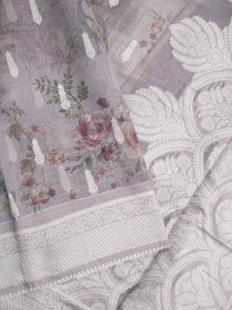 Chanderi fancy saree grey color allover prints & zari border with rich pallu and attached blouse