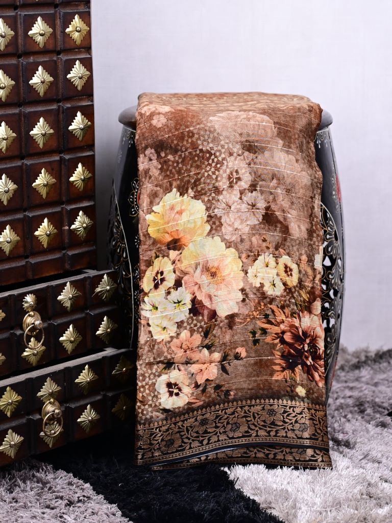 Chiffon fancy saree beige color allover stripes, prints and sequence work & zari border with short pallu and attached blouse