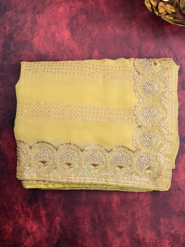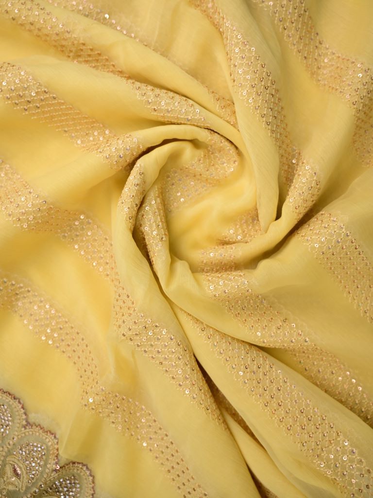 Chiffon fancy saree light yellow color allover embroidery & embroidery border with running pallu and attached fancy blouse