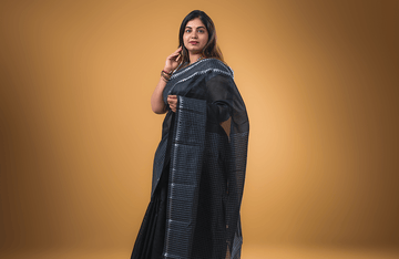 Chanderi fancy saree black color allover checks, zari motifs & zari border with zari pallu and self blouse