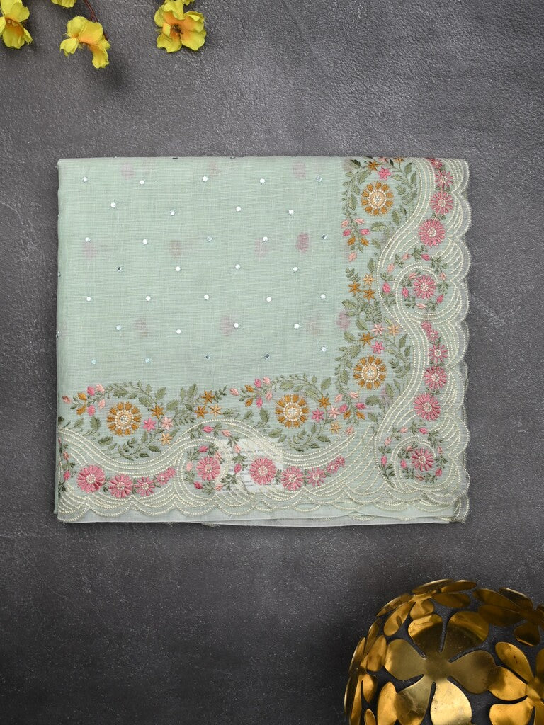Kota fancy saree light pastel green color allover embroidery motifs & zari border with short pallu and plain blouse