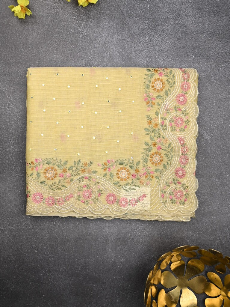 Chanderi fancy saree light yellow color allover mirror work & embroidery cutwork border with running pallu and attached blouse
