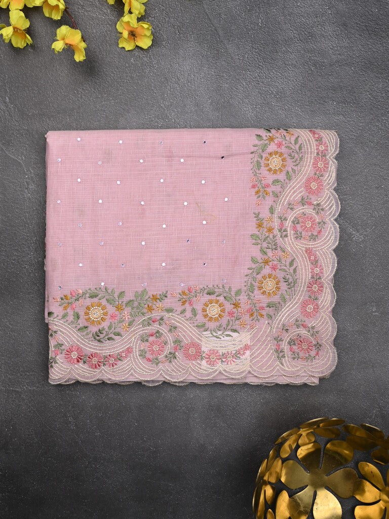 Chanderi fancy saree baby pink color allover mirror work & embroidery cutwork border with running pallu and attached blouse