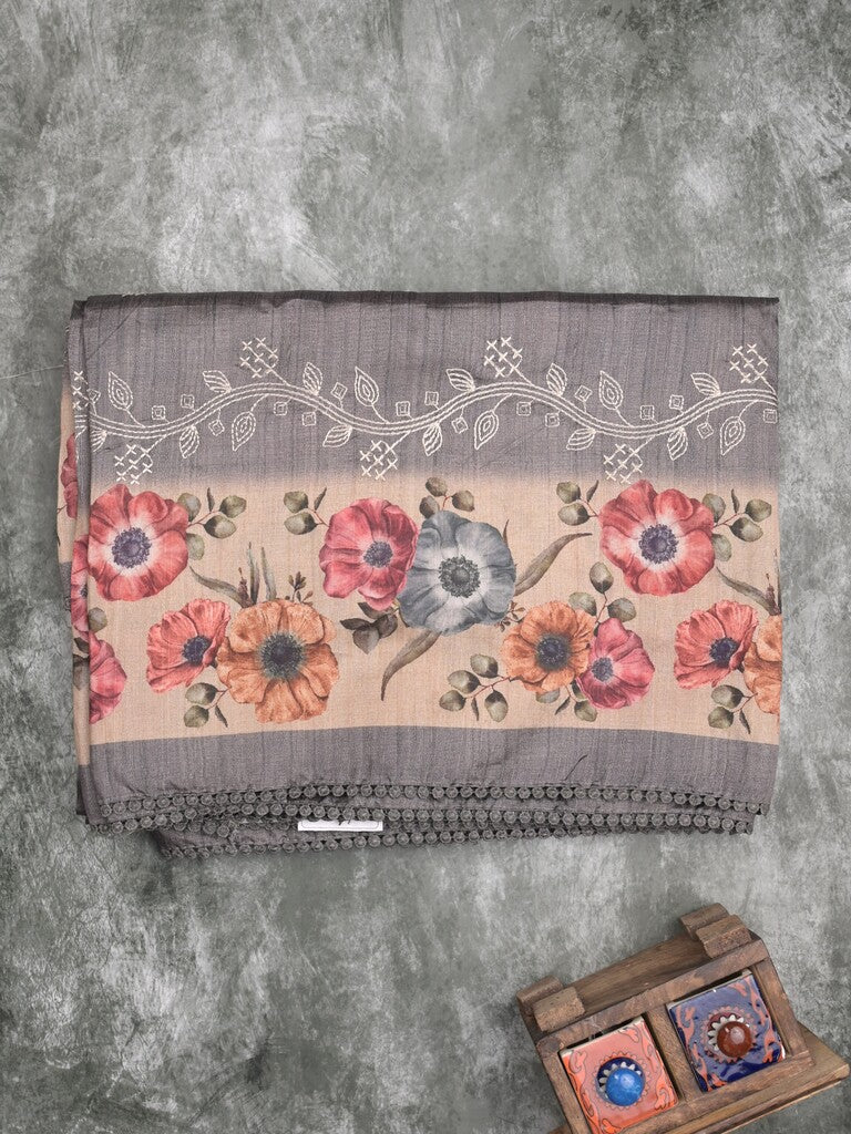 Tussar fancy saree grey color allover digital prints & small border with short pallu and attached plain blouse