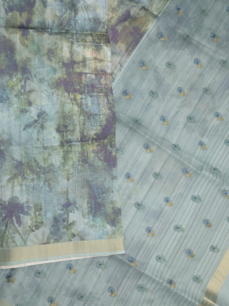 Tussar fancy saree bluish grey color allover prints & small kaddi border with printed pallu and attached plain blouse