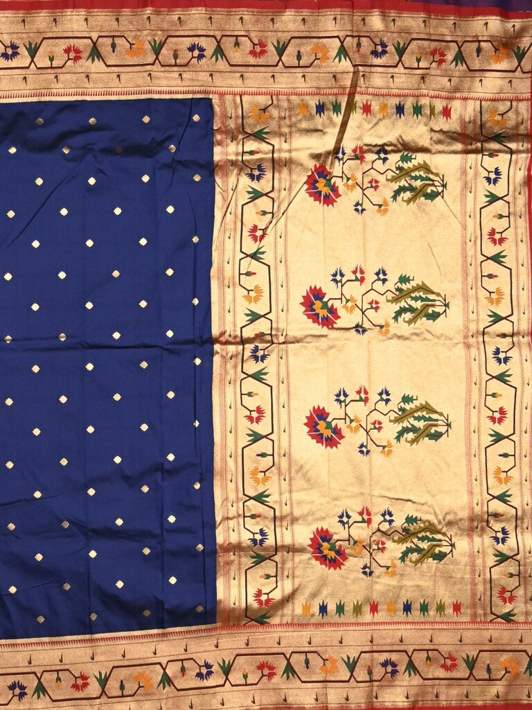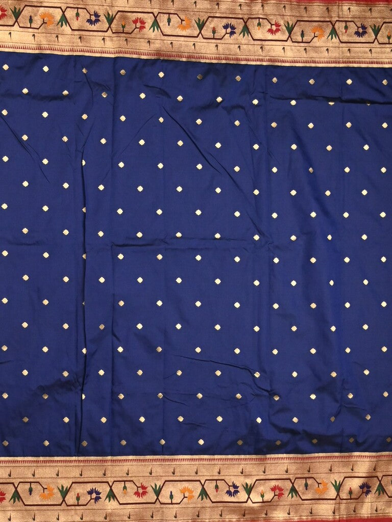 Banaras pattu saree royal blue color allover zari motifs & paithani border with paithani pallu and contrast blouse