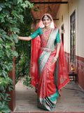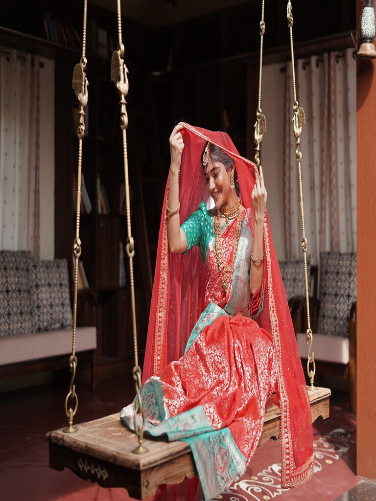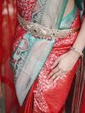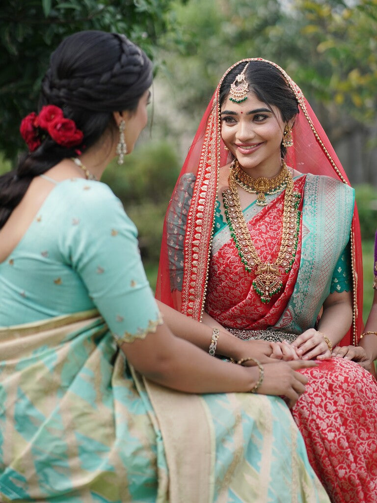 Bridal kanchi pattu saree red color allover zari weaves & zari border with rich contrast pallu and attached blouse