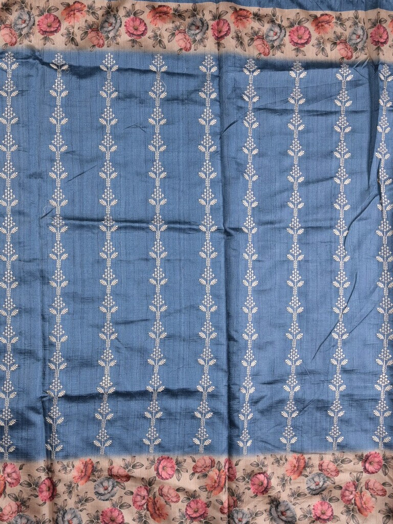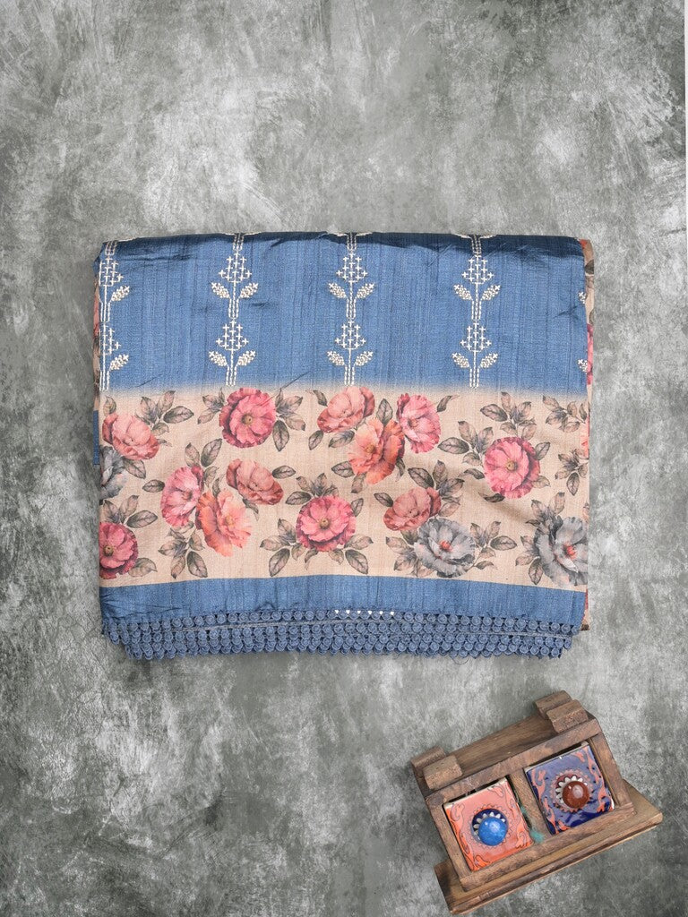 Tussar fancy saree blue color allover prints & printed border with printed pallu and contrast printed blouse