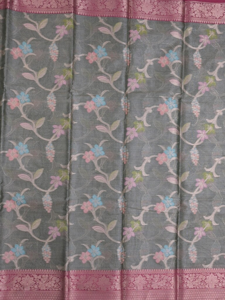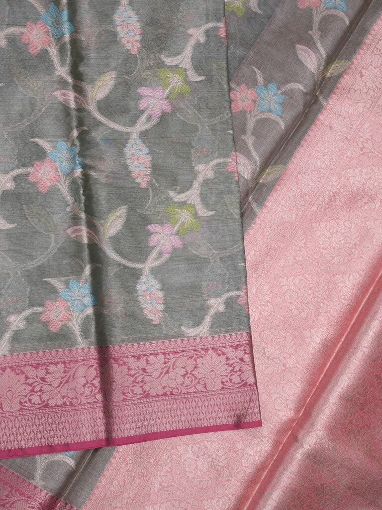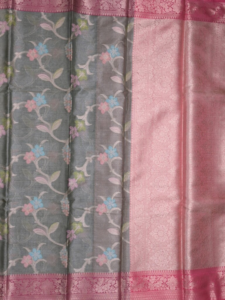Chanderi tissue fancy saree grey color allover zari weaves & zari border with short pallu and contrast blouse