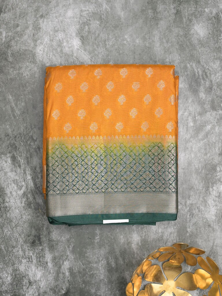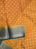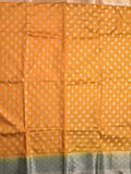 Dupion fancy saree mustard yellow color allover motifs & zari border with contrast pallu and attached blouse