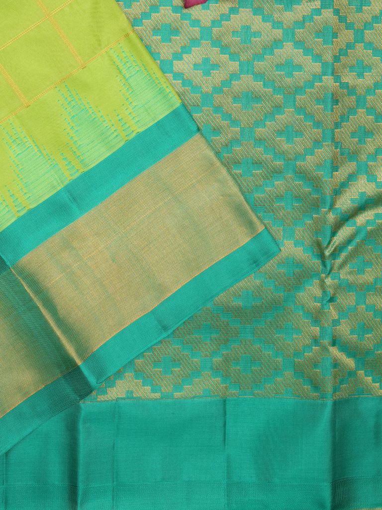 Gadwal pattu saree parrot green color allover zari weaves & kanchi border with rich pallu and contrast plain blouse