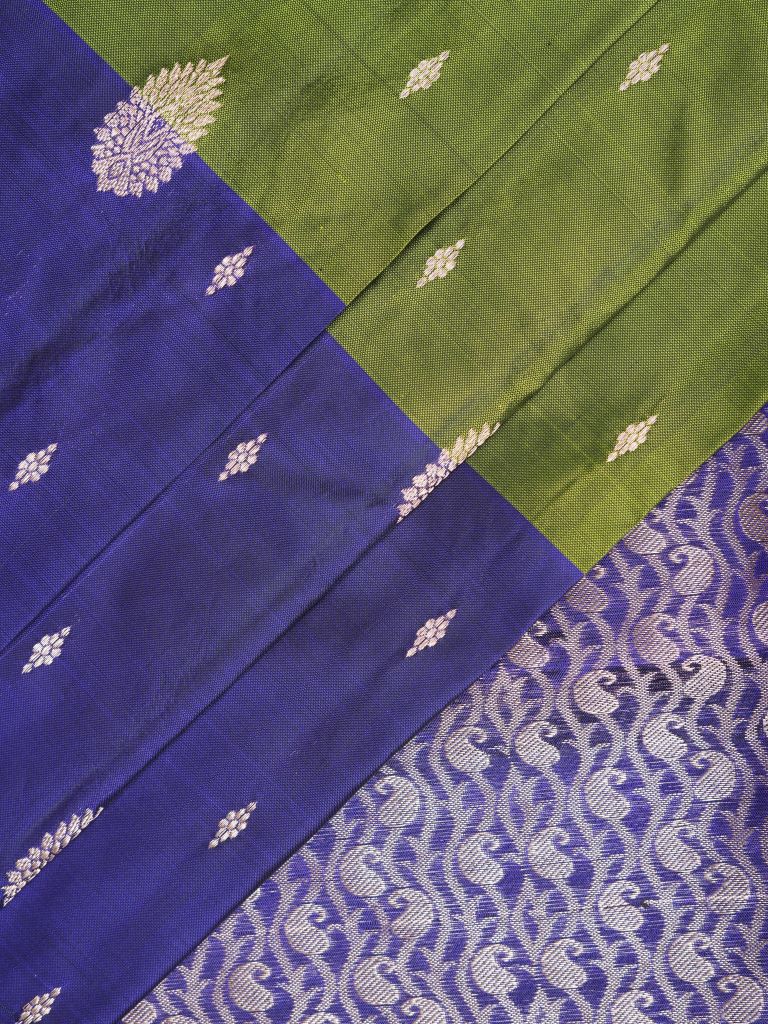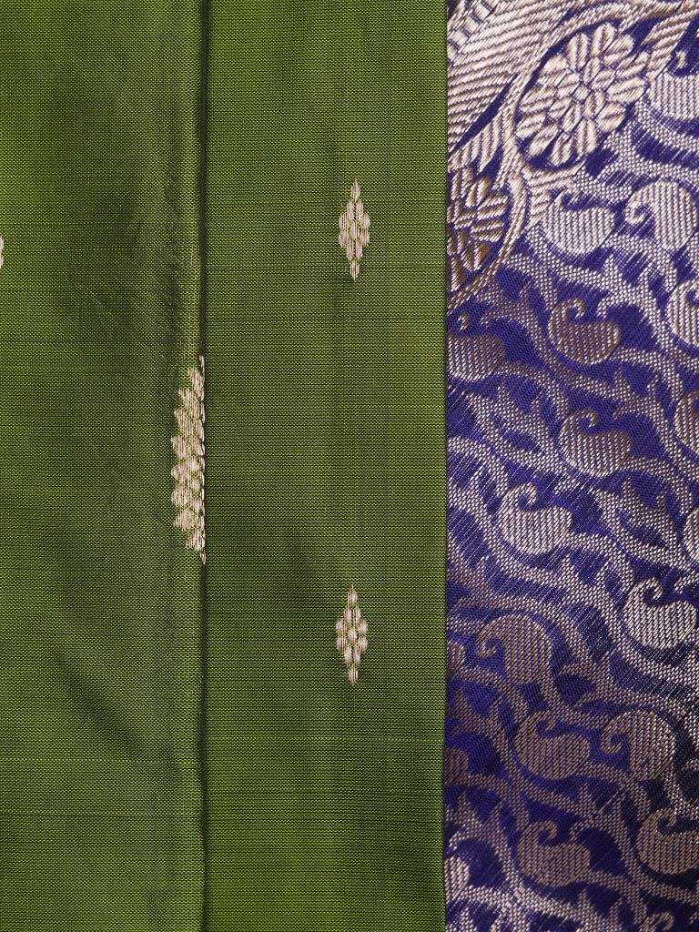 Kanchi pattu saree parrot green color allover zari motifs & zari border with rich pallu and contrast plain blouse
