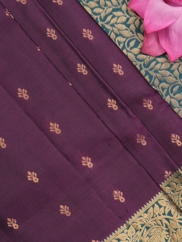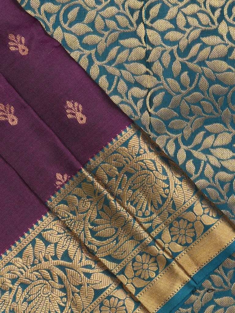 Kanchi pattu saree dark purple color allover zari motifs & zari border with rich pallu and contrast plain blouse