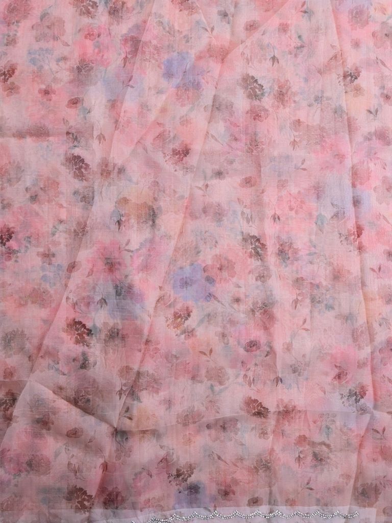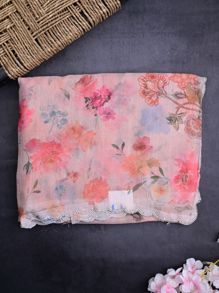 Soft organza fancy saree peach color allover digital prints & cutwork embroidery border with running pallu and printed blouse