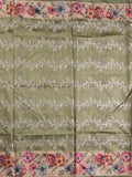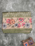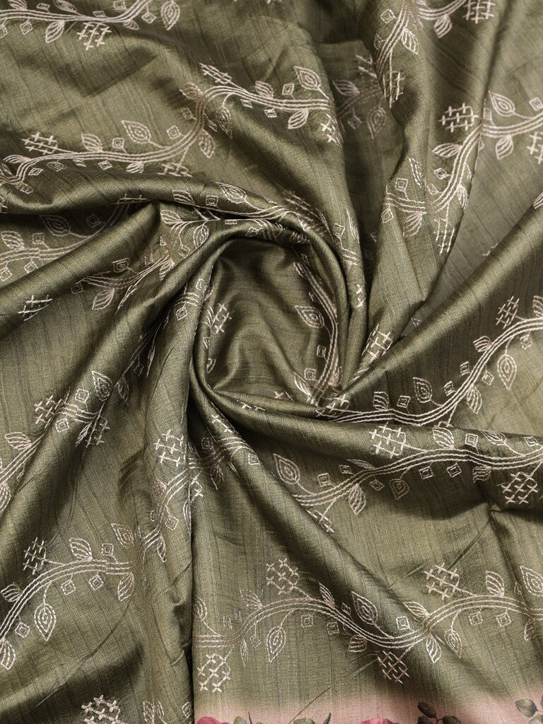 Tussar fancy saree olive green color allover prints & printed border with printed pallu and contrast printed blouse