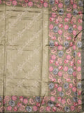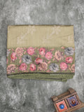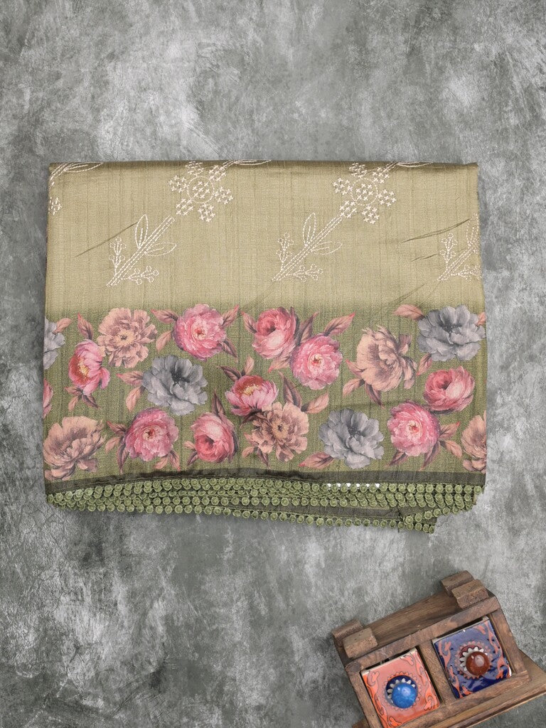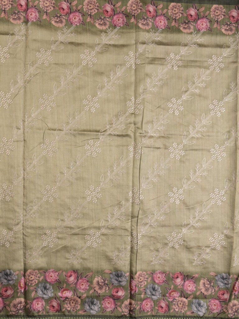 Tussar fancy saree light olive green color allover prints & printed border with printed pallu and contrast printed blouse
