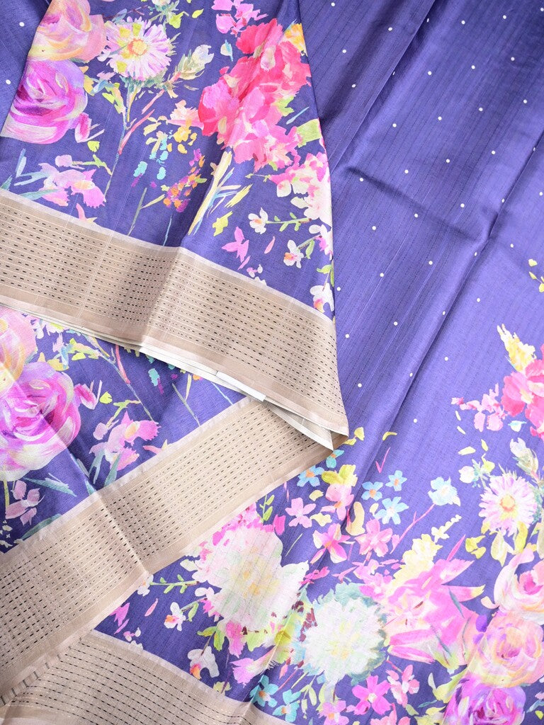Tussar fancy saree royal blue color allover prints & zari border with short pallu and contrast printed